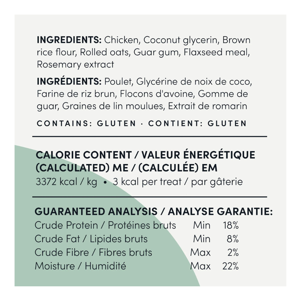 Each soft and chewy treat contains all natural ingredients starting with North American Chicken making it the perfect high protein snack for dogs of all ages and sizes.