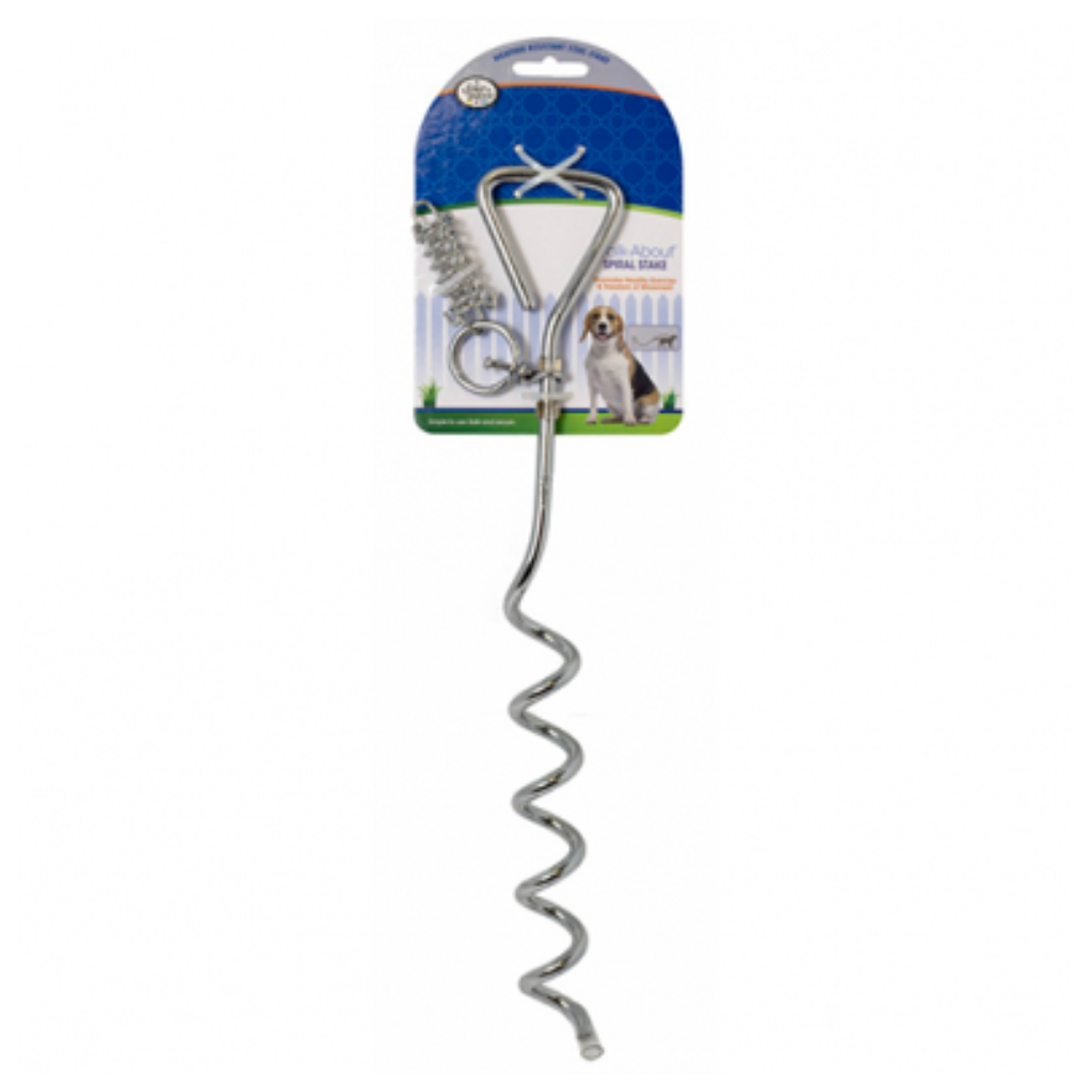 This spiral stake can be screwed into the ground for a secure hold. The Walk About® Stake features a shock absorber spring which reduces the tension between the pet and the tie-out cable for comfort and ease of use.