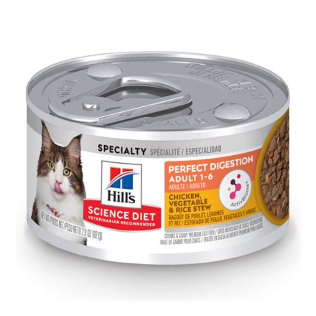 Hill's Science Diet Adult Perfect Digestion Chicken, Vegetable & Rice Stew Cat Food is formulated to meet the nutritional levels established by the AAFCO Cat Food Nutrient Profiles for maintenance of adult cats.