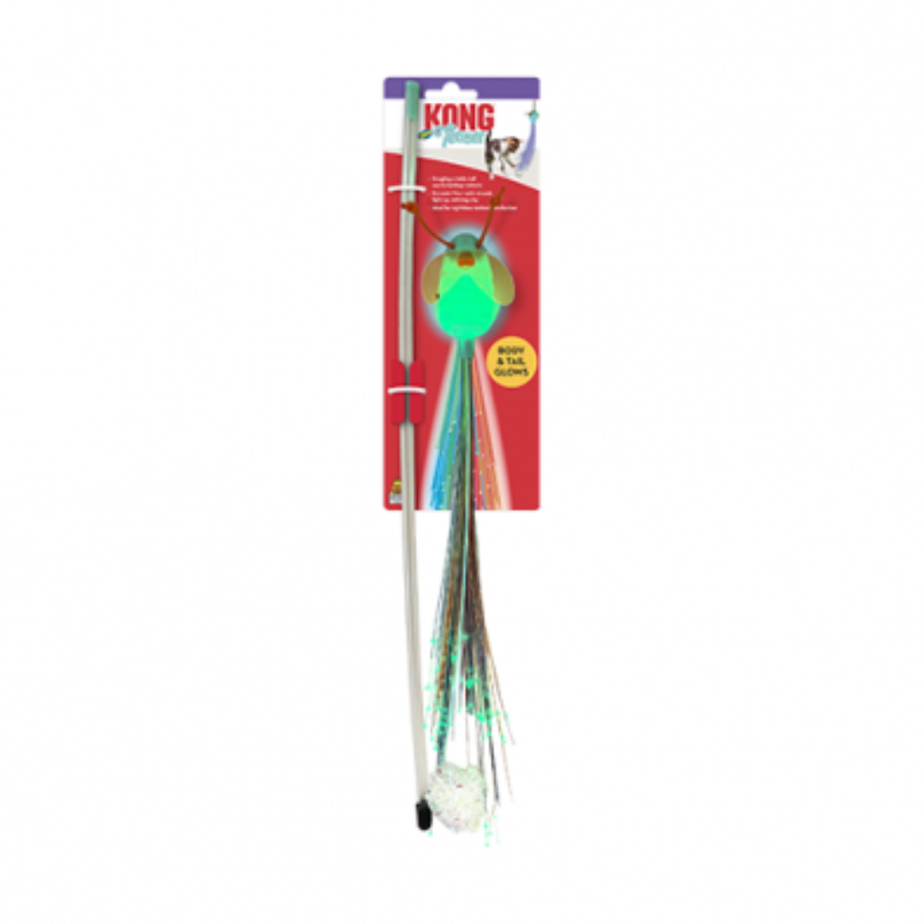 KONG Glow Firefly Teaser’s long, swaying strands light up to spark hunting instincts—especially when enjoyed in the dark. Dangling crinkle ball gives cats a batting target, while wings and antennae add extra allure. A long wand helps extend the fun and playful action. Batteries included.