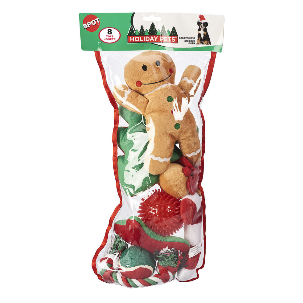 Holiday themed dog toys in a convenient festive stocking. 8 piece assortment.